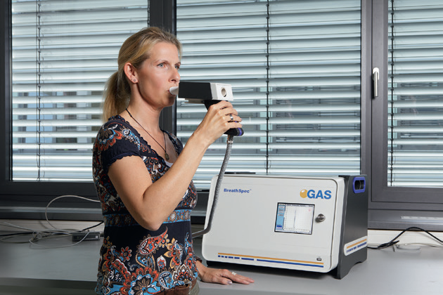 遠程取樣—呼吸采樣: 實際呼吸采樣只需一次呼氣。待測者呼氣進入采樣器,在后半部分,將5mL呼氣取樣到普通的注射器中。拉動注射器的活塞可以由待測者自己完成,或者由護士來幫助完成。如果采樣失敗,可以立即重復(fù)。